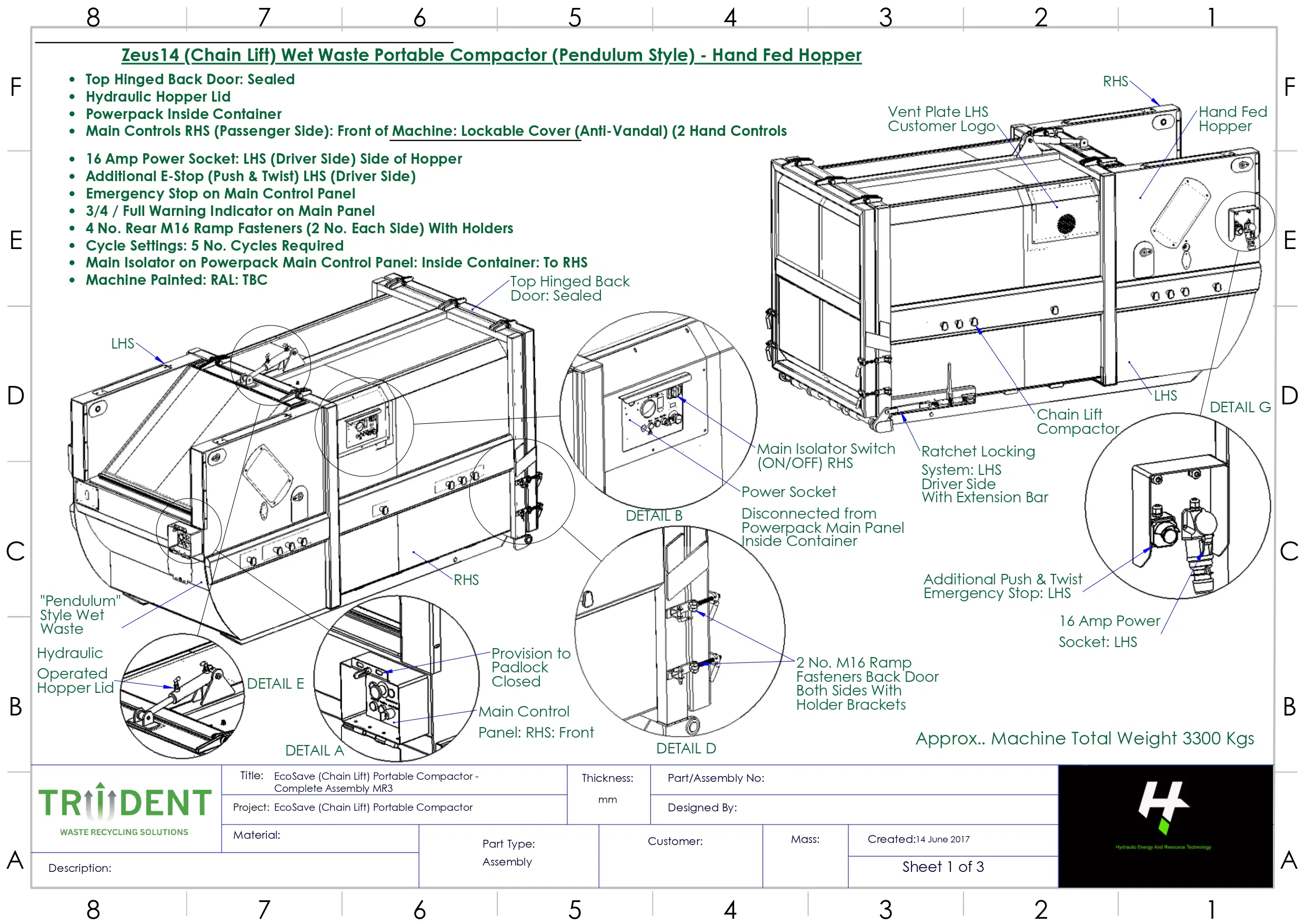 The Zeus14 Wet Waste Portable Compactor with Hand-Fed Front Loading is a compact and hygienic solution designed for sites with limited space. Ideal for handling wet waste, this model features a front-loading hopper and comes complete with a fitted multi-purpose bin lift for safe and efficient waste handling.
