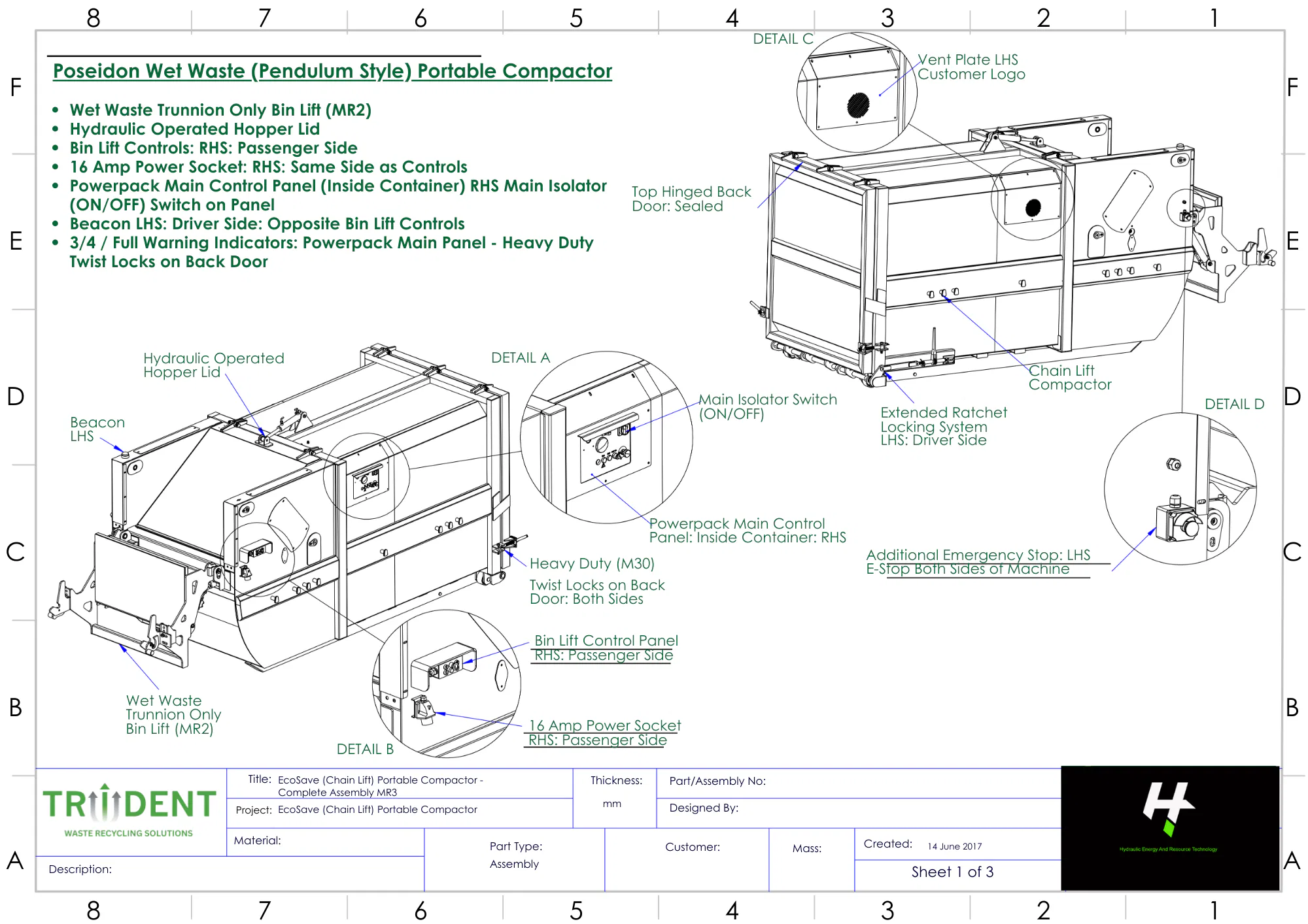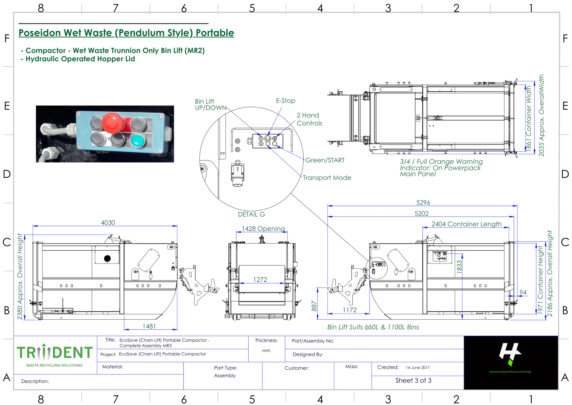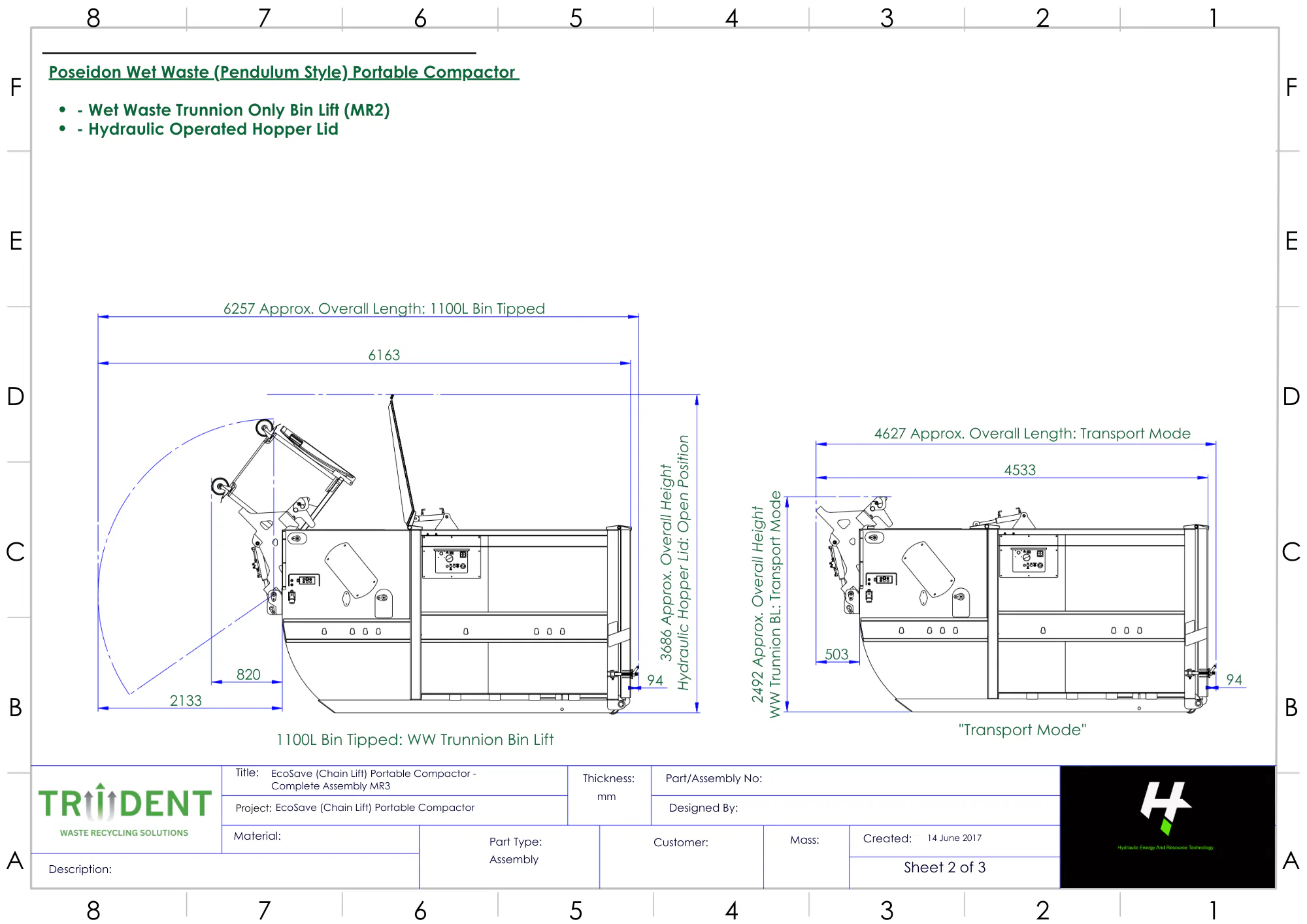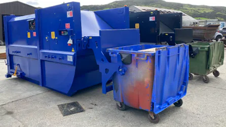 The Zeus14 Wet Waste Portable Compactor with WW Trunnion Bin Lift and Hand-Fed Front Loading is a compact and hygienic solution for sites with limited space. Designed for efficient wet waste handling, it features a front-loading hopper and a specialised trunnion bin lift system for safe and controlled waste disposal.