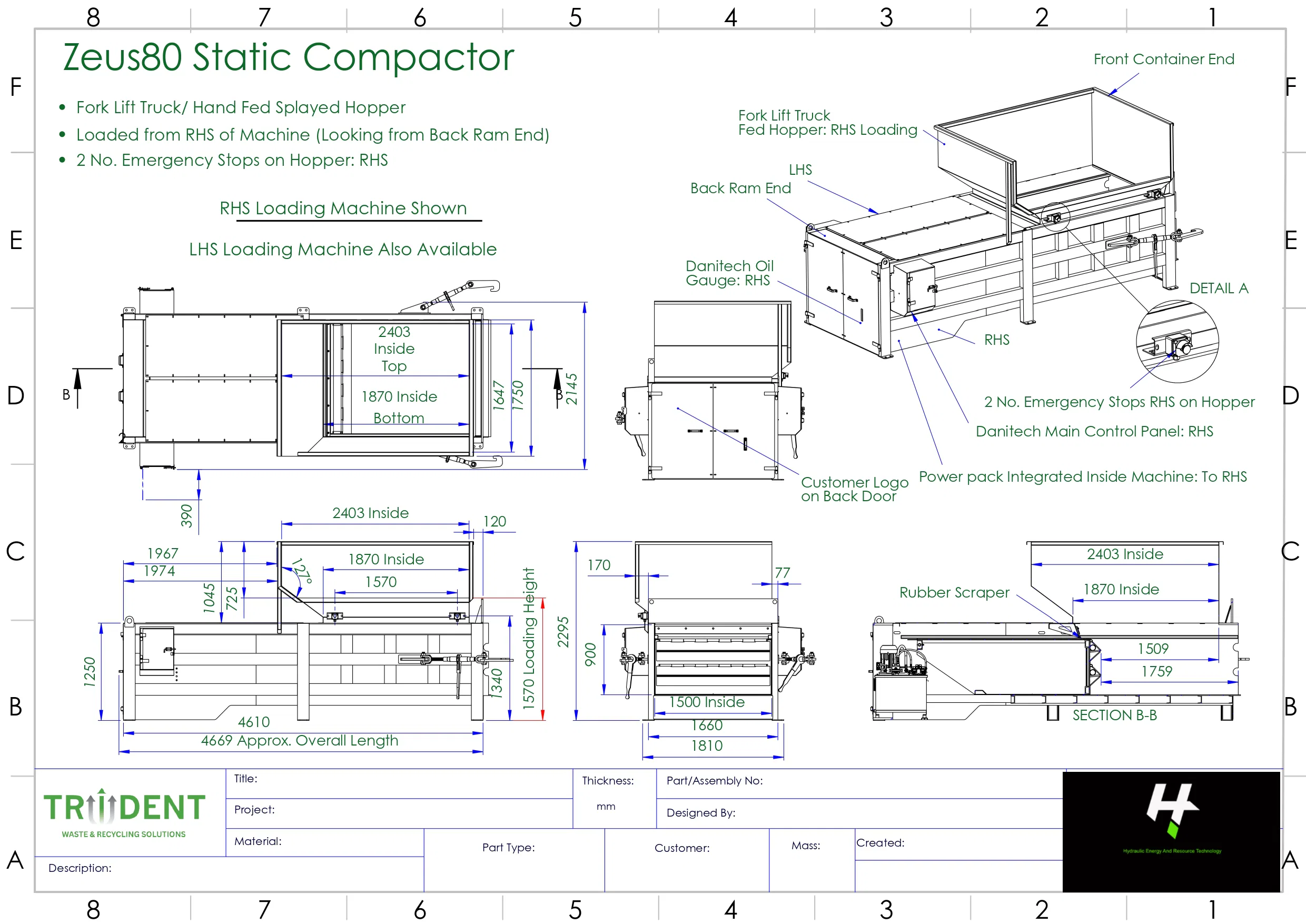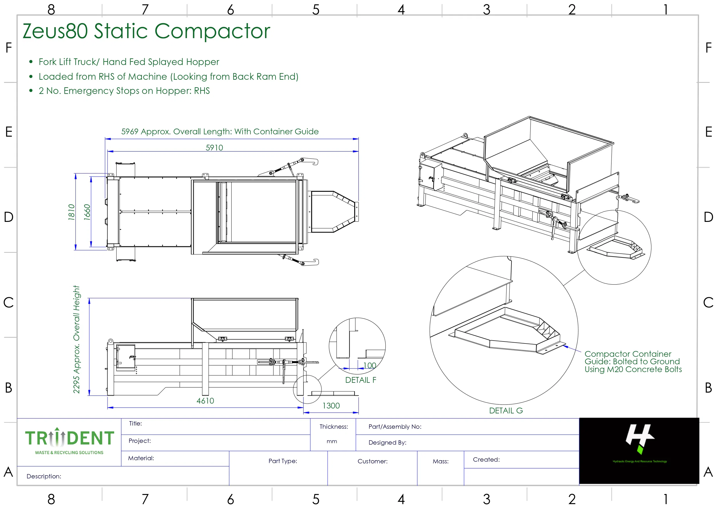 The Zeus80 Static Compactor: Open Splayed Hopper is a compact yet powerful waste solution designed for sites with limited space. Its open splayed hopper allows for easy and efficient loading of a wide range of waste materials.